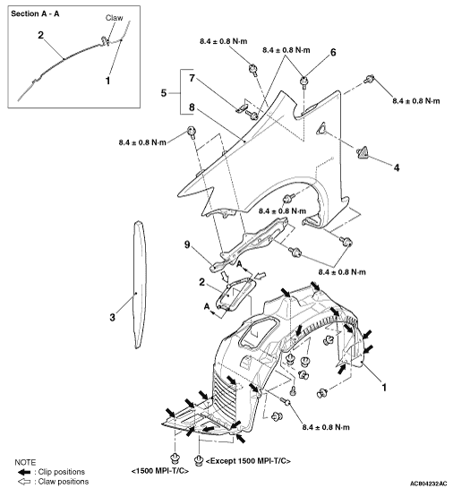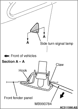 Insert the special tool ornament remover (MB990784) as shown to compress the hook and disengage the claw. Then remove the side turn signal lamp. |