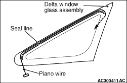 (1) To remove the adhesive from the bottom of the delta window glass, feed a piano wire into the passenger compartment through the hole, and then cut off the adhesive seal line by pulling the piano wire alternately from the inside and outside of the vehicle.