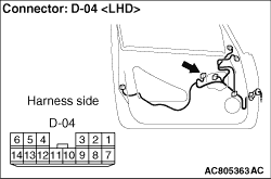 STEP 7. Connector check: D-04 power window main switch connector and D-14 power window sub switch (front) connector