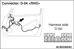 STEP 4. Connector check: D-04 power window main switch connector and D-14 power window sub switch (front) connector