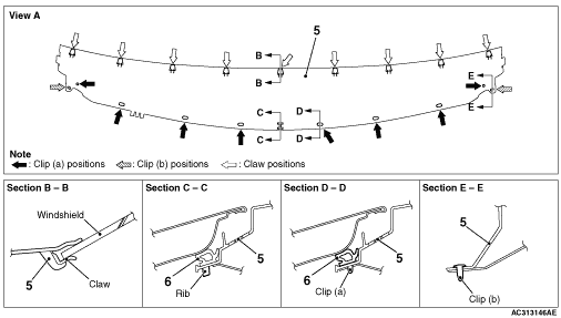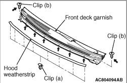 2.Remove the hood weather strip clips (a) and front deck garnish clips (b).
