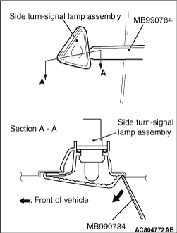 Use an appropriate tool such as special tool MB990784 to pry out the tab from the fender, and remove the side turn-signal lamp assembly.