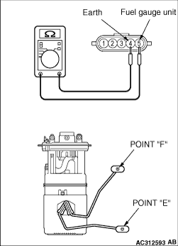 2.When float of the fuel pump and gauge unit is in stopper positions "F" and "E", ensure that resistance between the fuel pump and gauge unit terminal and earth terminal is within the standard value.