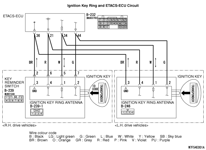 STEP 6. Check the wiring harness between key ring antenna connector B-246 <L. H. drive vehicles> or B-239-1 <R. H. drive vehicles> (terminal 1) and ETACS-ECU connector B-232 (terminal 34).