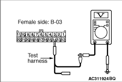(1)Disconnect the connector, and measure at its female-side intermediate connector (at the front wiring harness side). (2)Connect the negative battery terminal, and turn the ignition switch to the ON position.
