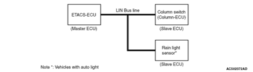 The ETACS-ECU operates the windshield wipers according to the wiper request signal from the rain light sensor when the vehicle is driven with the windshield wiper switch in the "INT" position.