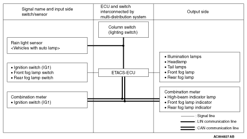 The multi-distribution system is adopted in the following circuit. The following circuit diagram shows input switches, input sensors, and correlation of ECUs interconnected via multi-distribution line buses.