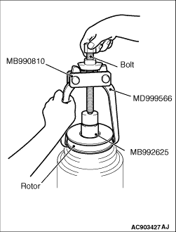 Rotor can be removed by hand, but if it is difficult to remove it, use the guide (MB992625) and the side bearing puller (MB990810) as shown.