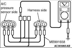 2.Disconnect the A/C pressure sensor connector and connect the special tool test harness (MB991658) as shown. 3.Start the engine and then turn ON the air conditioner switch. |