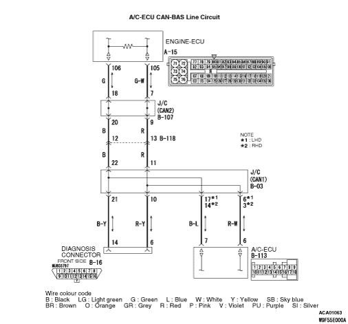 If communication with all other systems is not possible, there is a high possibility that there is a malfunction of the diagnosis line. If only the A/C system cannot communicate with the M.U.T.-III, the A/C-ECU may be defective.