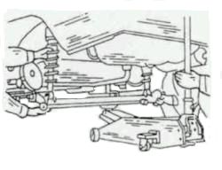 14.1.2. СНЯТИЕ И УСТАНОВКА СТОЕК АМОРТИЗАТОРОВ.• Заднюю часть автомобиля установите на козлы и снимите оба задних колеса для получения доступа к пружинам амотизаторов. • Подставте домкрат под середину заднего моста (см.рис.215) и поднимате последний до тех пор пока не увидите, что амортизаторы сжались. • Для получения доступа к верхней части крепления амортизатора (крепление стойки амортизатора) снимите обшивку изнутри багажника. Удалите колпачок, расположенный над стойкой амотизатора, и две гайки, изображенные на рис.216.