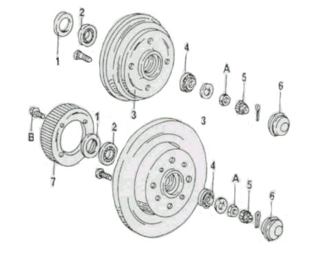 • Наденьте на ступицу предохранительное кольцо гайки и сразу же вставьте шплинт. Если сразу вставить шплинт нельзя, открутите гайку максимум на 15 (на четверть одной грани гайки), но ни в коем случае не больше. • Задействуйте несколько раз ручной тормоз,чтобы выдвинуть тормозные колодки к барабану (только для барабанного тормозного механизма). • Если у Вас есть пружинный динамометр, проверьте для безопасности момент затяжки подшипников ступиц задних колес. Динамометр прицепите к одному из болтов крепления колеса. Для этого вращайте ступицу колеса до тех пор, пока один из болтов крепления не окажется на верхней стороне. После этого подсоедините к нему пружинный динамометр. Потяните динамометр наружу и снимите его показания в тот момент, когда ступица начнет двигаться. Для нового подшипника ступицы колеса эти показания должны быть не более 1,4 кг. Для уже работавшего подшипника эти показания могут уменьшиться до 1,1 кг. Если Вы не получили указанных значений, то новый подшипник необходимо снова отрегулировать, а уже работавший - вообще заменить. 14.3.2. ЗАМЕНА ПОДШИПНИКА СТУПИЦЫ ЗАДНЕГО КОЛЕСА• Заменить подшипник ступицы колеса довольно просто. При этом обратите внимание на то, что подшипники выпускаются разными фирмами и нужно стараться устанавливать подшипник одного и того же производителя. • С помощью отвертки удалите масло-уплотнительное кольцо с обратной стороны- тормозного барабана или диска, а затем извлеките освободившийся подшипник. • Тщательно очистите внутреннюю часть тормозного барабана или диска и вы-прессуйте внешнее вращающееся кольцо подшипника изнутри ступицы колеса. Сначала выпрессуйте кольцо подшипника, поворачиваемое тормозным барабаном или диском, а затем уже все осталь-. ные кольца. Прорези на внутренней стороне ступицы колеса позволяют установить стержень (см. рис. 224). • Новые вращающиеся кольца подшипника запрессовывайте в ступицу колеса с противоположных сторон таким образом, чтобы они полностью вошли в нее по всей окружности. Обязательно заменяйте вращающиеся кольца подшипников, ни в коем случае не устанавливайте новые сепараторы, оставив старые кольца в ступице колеса. • Полость внутри ступицы заполните консистентной смазкой, но оставьте достаточно места, чтобы можно было установить наконечник оси. Такую же смазку нанесите на ролики подшипника. • Вставьте задний подшипник, нанесите смазку на внешнюю сторону уплотнительного кольца и на рабочую кромку уплотнения. Запрессуйте кольцо прямо в обратную сторону ступицы таким образом, чтобы внешняя поверхность была закрыта. • Снова установите тормозной барабан со ступицей или тормозной диск и отрегулируйте подшипник ступицы, пользуясь реклмендациями предыдущей главы. Не затягивайте подшипник слошком плотно, поскольку он при этом будет заедать. | ||||||||||||||||||||||||||||