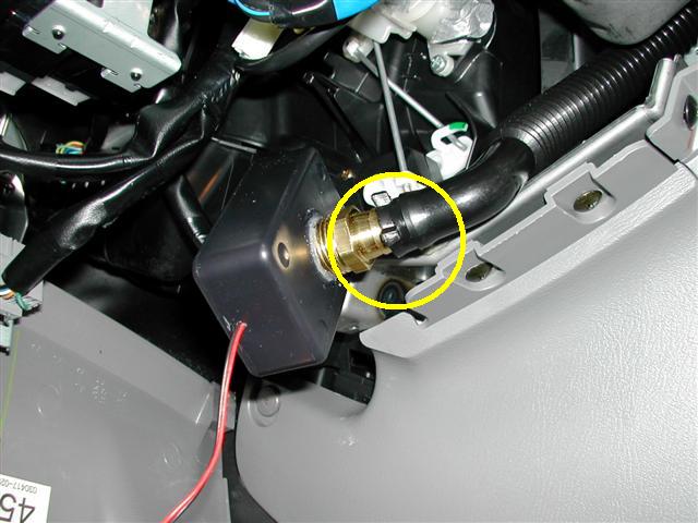 Step 7 - This is the tricky part. Route the aspirator hose lower, install the metal support bracket. Make sure that the hose is not kinked or pinched. Place the assembly behind the metal bracket. There is a small metal sleeve that the box will fit into. Make sure that it does not interfere with the Vent Control Servo by turning the key to RUN, the fan to HIGH, and cycling through the Vent Selector and Defroster. All vents - dash, floor, defroster - should work normally.