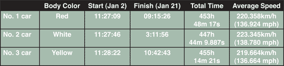 All cars passed 40,000km, and strategy was revised. The No. 2 car was selected as the leading contender for the new world record. The No. 1 and No. 3 cars dropped speeds below 230km/h (142.9 mph), while No. 2 car remained above 230km/h. On the 9.182km (5.7-mile) course, that meant the slower cars were lapped every two hours, which proved helpful for communication between the drivers.