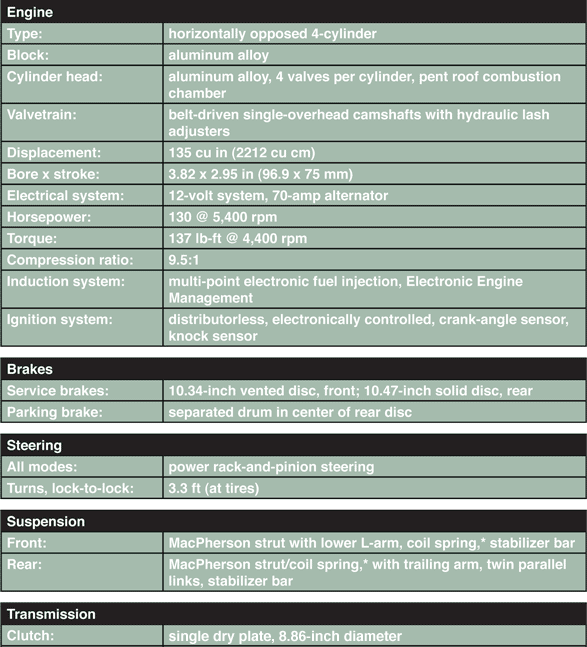 - 2.2-liter, overhead-cam, 16-valve, 130-hp horizontally opposed 4-cycle engine