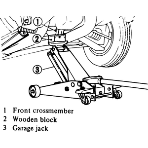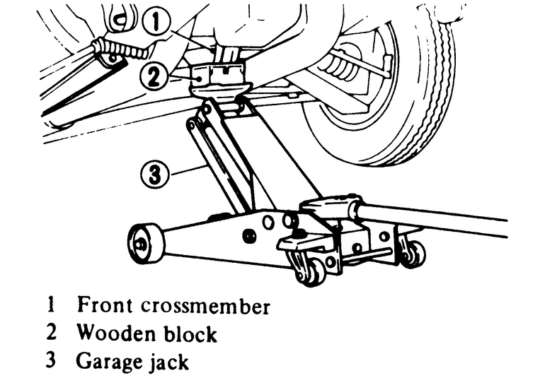 | Fig. 2: Jacking the front of the vehicle with a hydraulic jack — 1970–82 models |