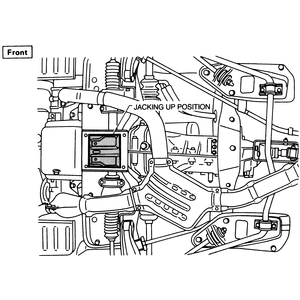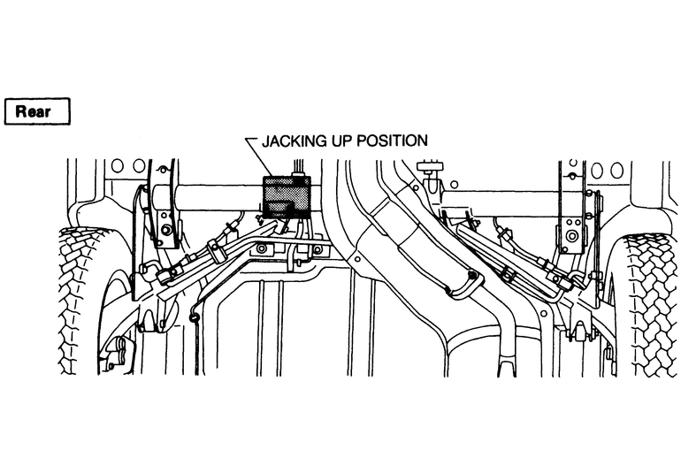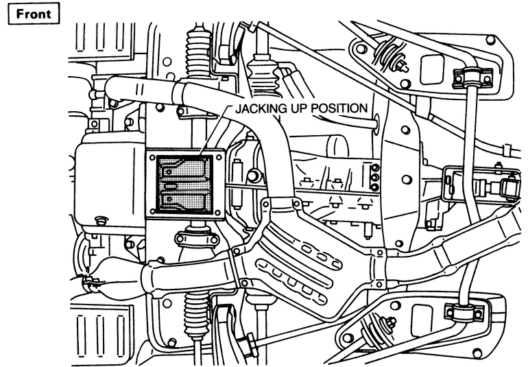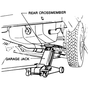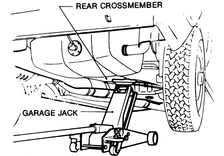When raising the front of the vehicle using a hydraulic jack always use the front crossmember as the contact point, never a suspension or steering part and never the engine oil pan. Always block the rear of the back wheels, and always use a block of wood between the saddle of the jack and the crossmember. When raising the rear of the vehicle using a hydraulic jack, place blocks in front of the front wheels and always place the jack in contact with the center of the rear crossmember. On four wheel drive models contact the bottom of the rear differential carrier. Always jack slowly until the vehicle is high enough to place the jackstands in their proper positions. The safety stands should be placed in the same location points as shown on the jacking point diagram. Make sure the stands are set on the flange of the side sill.