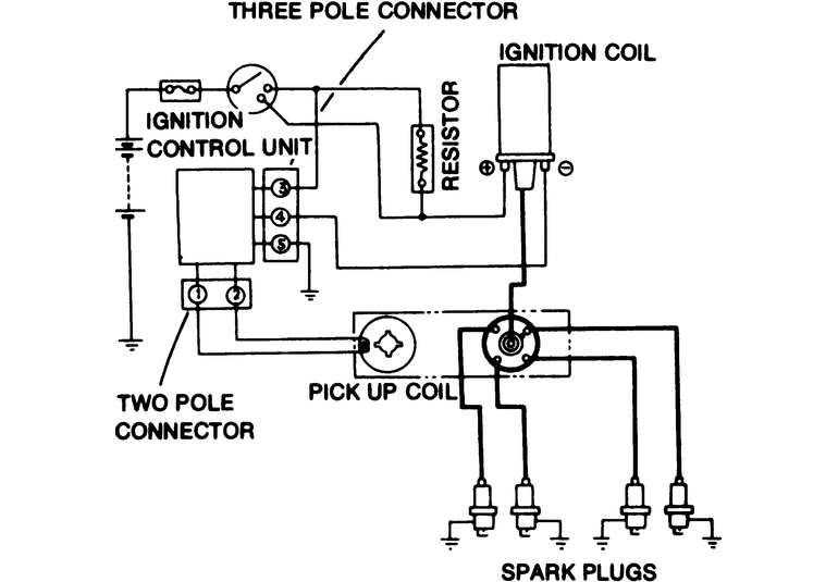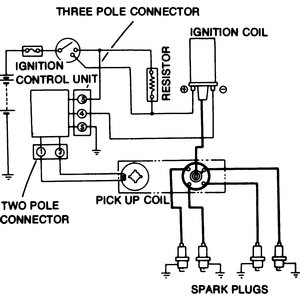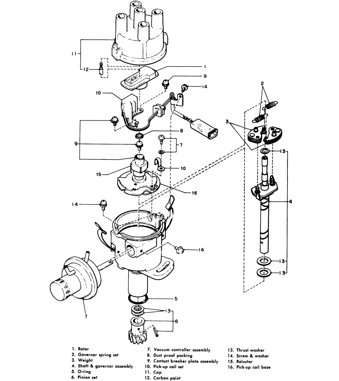 Located in the distributor, in addition to the normal ignition rotor, is a four spoke rotor (reluctor) which rests on the distributor shaft where the breaker points cam is found on earlier systems. A pick-up coil, consisting of a magnet, coil, and wiring, rests on the breaker plate next to the reluctor. The system also uses a transistor ignition unit mounted above the ignition coil on the fender well.