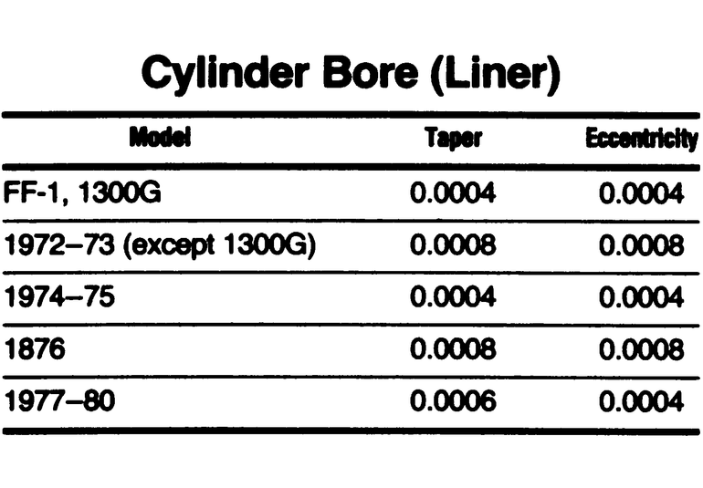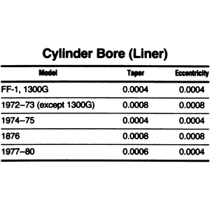 Visually inspect the cylinder bores (liners) for roughness, scoring, or scuffing. If evident, the cylinder bore (liner) must be bored or honed oversize to eliminate imperfections, and the smallest possible oversize piston used. Since 1970–75 model engines use removable cylinder liners these can either be replaced or honed to oversize so long as the honing will not exceed 0.020 in. (0.508mm)
