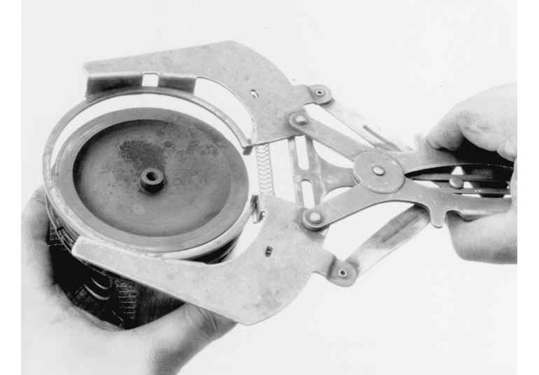 | Fig. 1: Using a ring expander tool to remove the piston rings |
