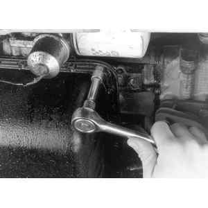 | Fig. 1: Remove the oil pan bolts . . .