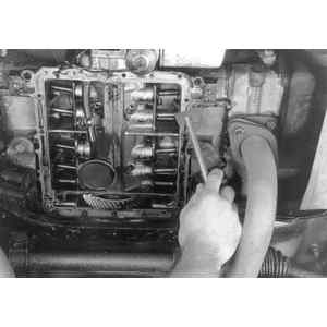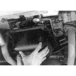- Remove the attaching bolts which hold the oil pan to the bottom of the crankcase,