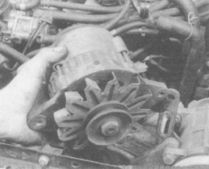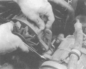 | Fig. 2: Loosen and remove the alternator mounting