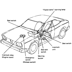 The car cannot be started unless the seat belts are fastened in a specific order. The driver (and front seat passenger) must get into the car, close the door(s), sit down, and then fasten the seat belts. If the seat belts are not fastened, or if they are fastened before the driver (and passenger) sit down, the car will not start, and the light and buzzer will operate. This prevents the belts from being permanently fastened and shoved behind the seats.