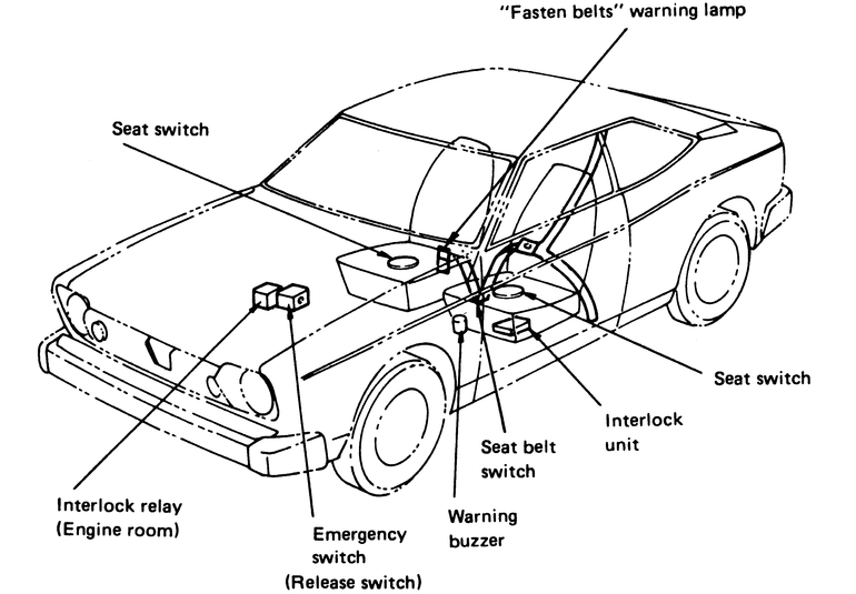 The following components are used for the seat belt/starter interlock system: a logic module (transistorized), two pressure sensitive front seat switches, a starter relay, a bypass (emergency start button, two seat belt buckle switches, a warning buzzer, and a warning light.