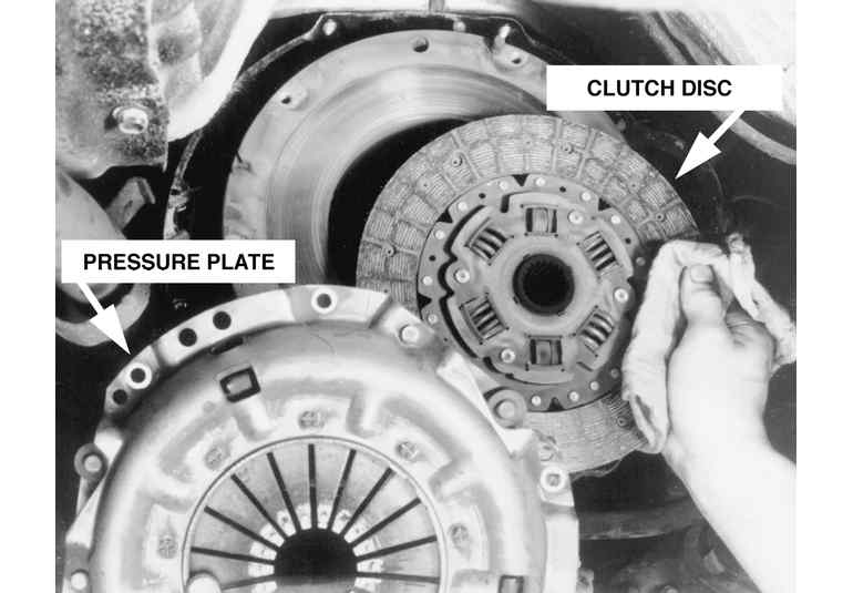 NOTE: Do not disassemble either the clutch cover or disc. Inspect the parts for wear or damage and replace any parts as necessary. Replace the clutch disc if there is any oil or grease on the facing. Do not wash or attempt to lubricate the throwout bearing. If it requires replacement, the bearing may be removed and a new one installed in the holder by means of a press.