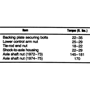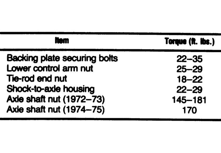 | Fig. 4: Front bearing and hub torque specifications — 1972–75