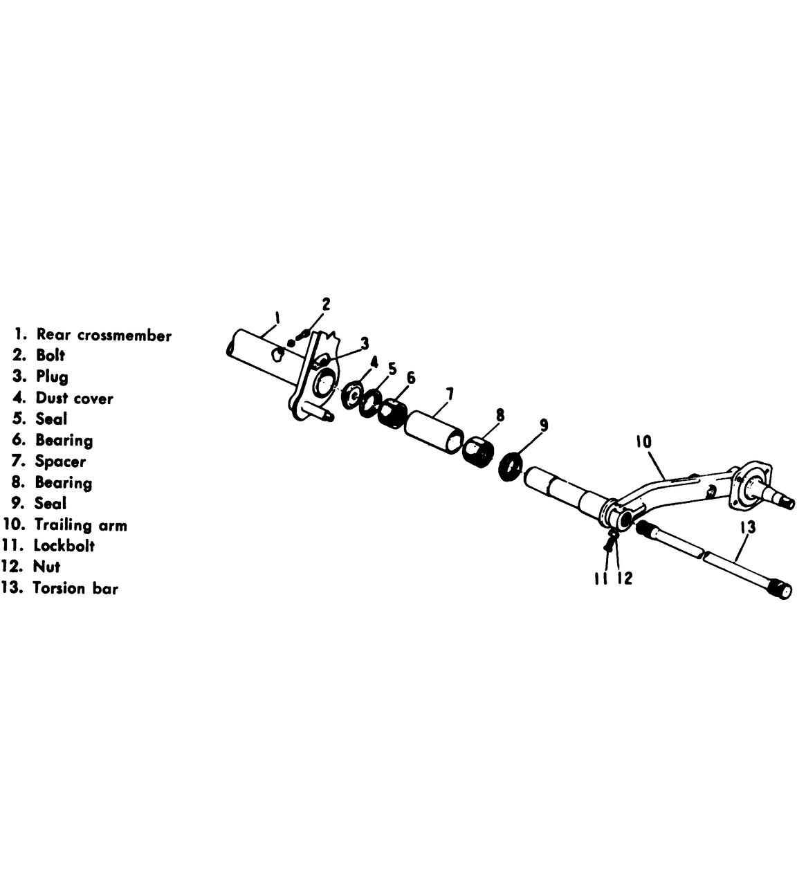 | Fig. 1: Exploded view of a typical trailing arm and torsion bar assembly — 1970–72 ff–1 sedans and wagons, 1300G wagons |