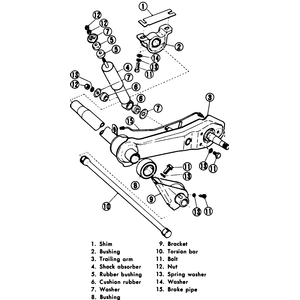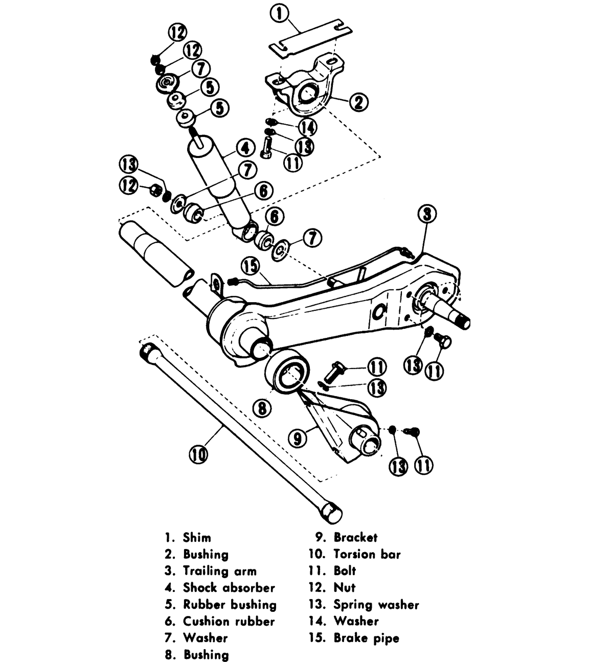 | Fig. 2: Exploded view of a typical rear suspension (except ff–1 and 1300G and 4WD) |