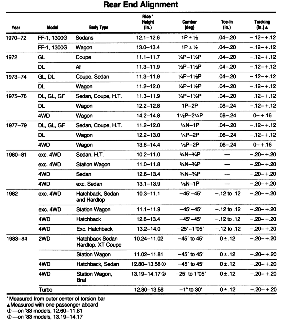 NOTE: Rear wheel toe-in on 1980–84 models is not adjustable. If any of the rear suspension components become worn or damaged, they must be replaced in order to bring the rear alignment back within specification.