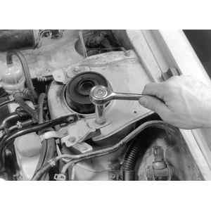 - Use a spanner or a large open end wrench to keep the upper spring seat from
