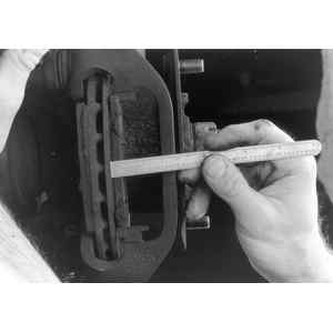 Inspect the brake pads for excessive or uneven wear, fluid contamination, bent and/or broken parts and cracks. If any of these conditions exist, replace the brake shoes.