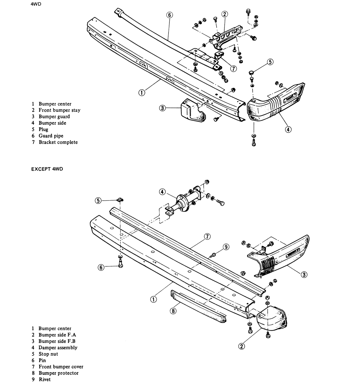 - Remove the 2 bolts that secure each lower end of the bumper to the body.