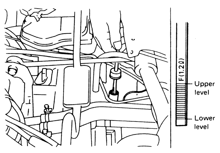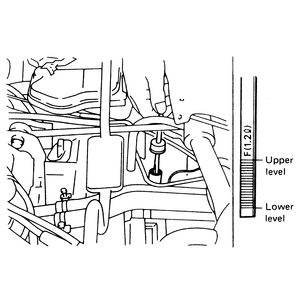 | Fig. 2: Front drive axle dipstick and level marks — 1.8L models |