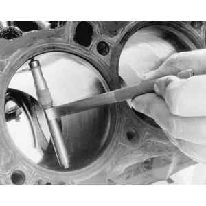 Using a telescoping gauge or an inside micrometer, measure the diameter of the cylinder bore, perpendicular (90°) to the piston pin, at 1–2 1⁄2 inch (25–64mm) below the surface of the cylinder block. The difference between the two measurements is the piston clearance.