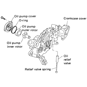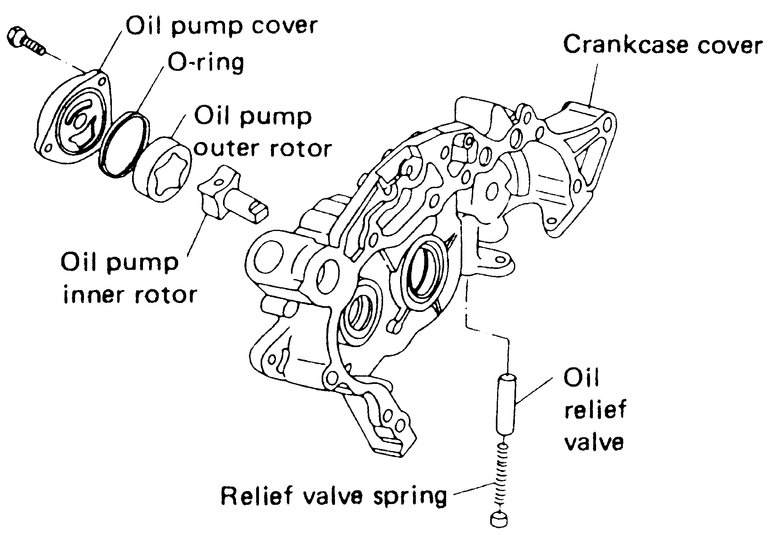 The oil pump is an integral part of the crankcase cover, located at the front