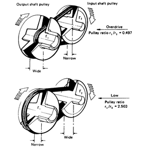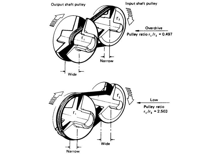 The power from the transaxle is transmitted through a special steel belt that runs between 2 variable pulleys, as the power is transmitted from the engine through the transaxle, the control computer varies the space between the pulleys depending on engine load, vehicle speed and throttle position. The varying of the pulleys allows the belt to ride in a constantly changing space, this has the effect of a continuous gear change.