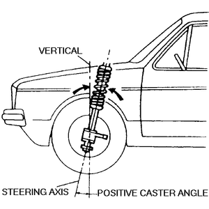 Wheel alignment is defined by three different adjustments in three planes. Looking at the vehicle from the side, caster angle describes the steering axis rather than a wheel angle. The steering knuckle is attached to the strut at the top and the control arm at the bottom. The wheel pivots around the line between these points to steer the vehicle. When the upper point is tilted back, this is described as positive caster. Having a positive caster tends to make the wheels self-centering, increasing directional stability. Excessive positive caster makes the wheels hard to steer, while an uneven caster will cause a pull to one side.