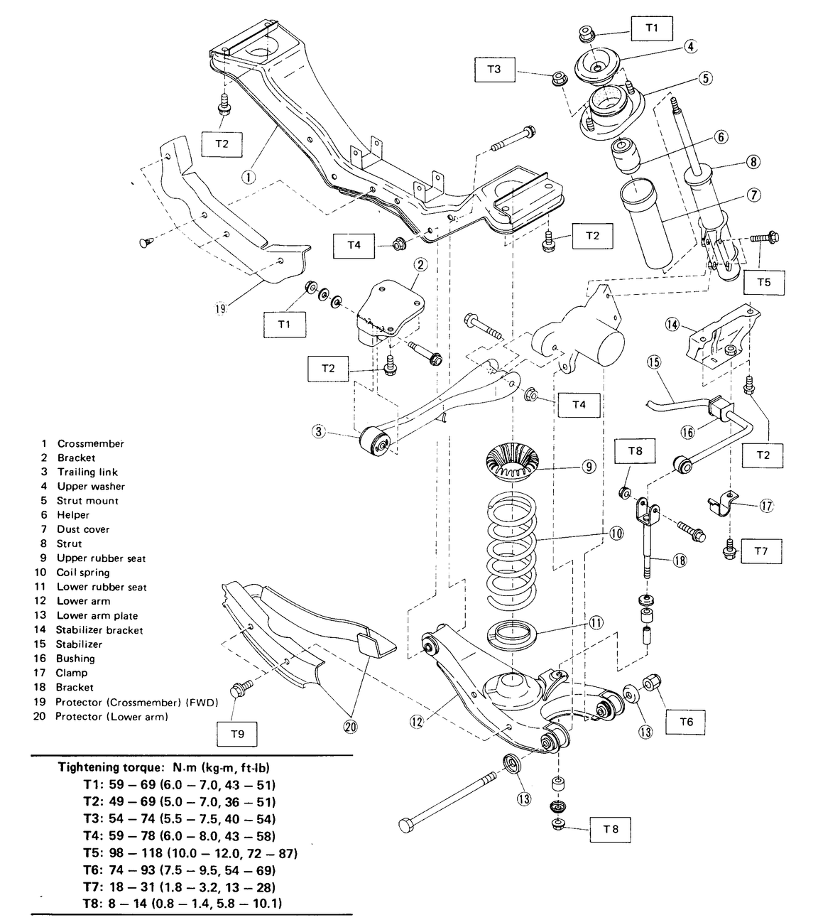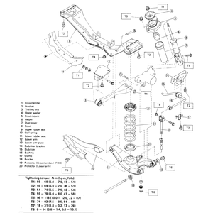 Install the 2 upper strut mounting nuts and tighten to 47 ft. lbs. (64 Nm).