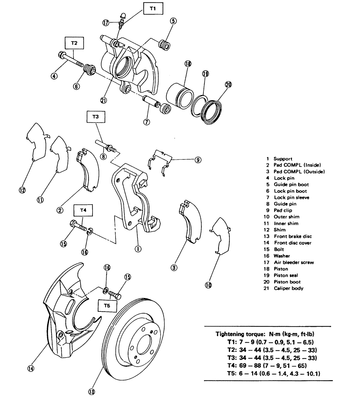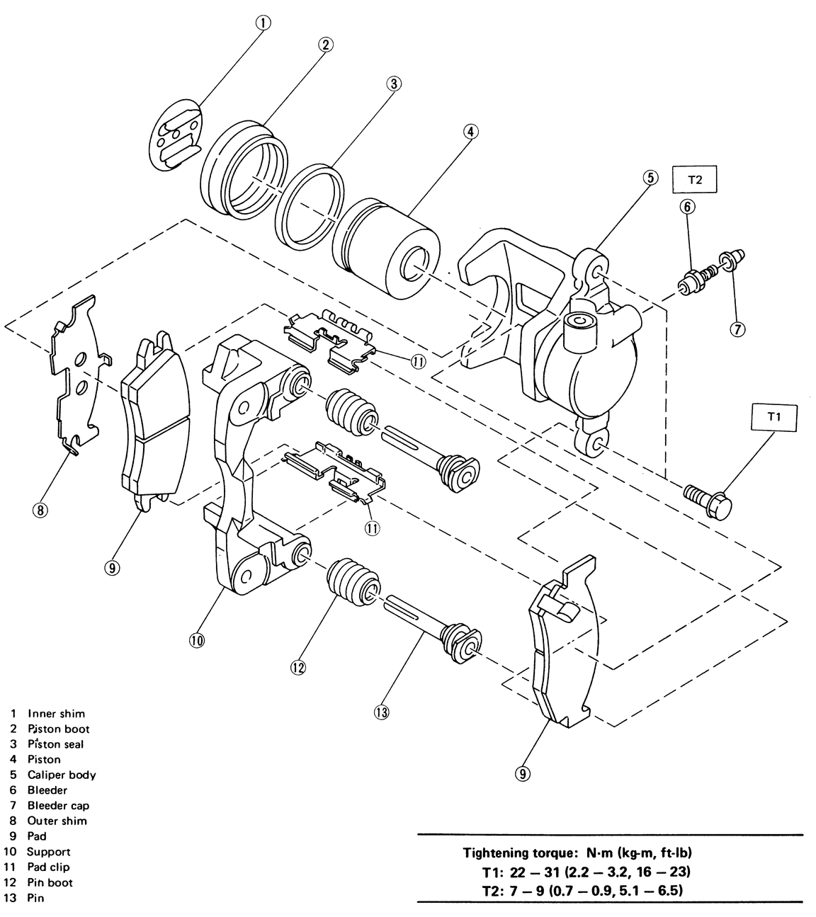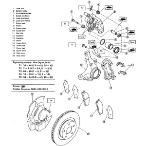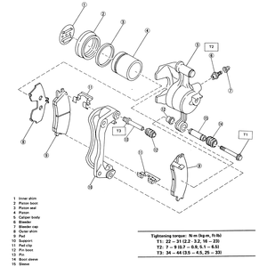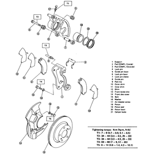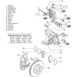 | Fig. 2: Front caliper and pad assembly — Justy with 13-inch wheel |
