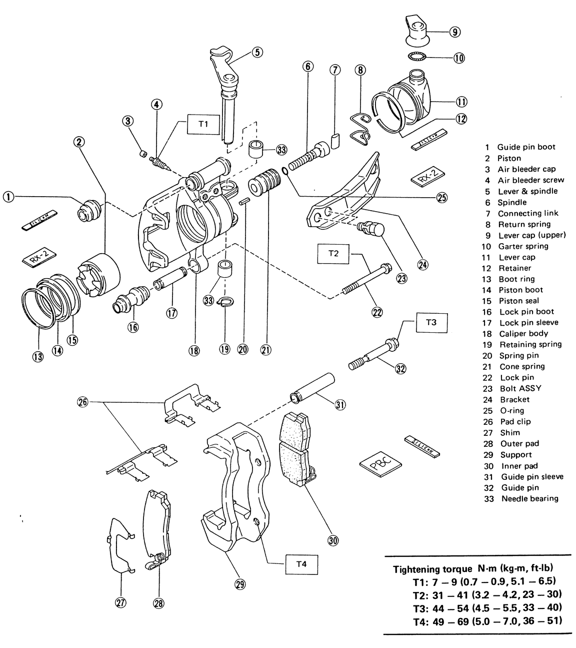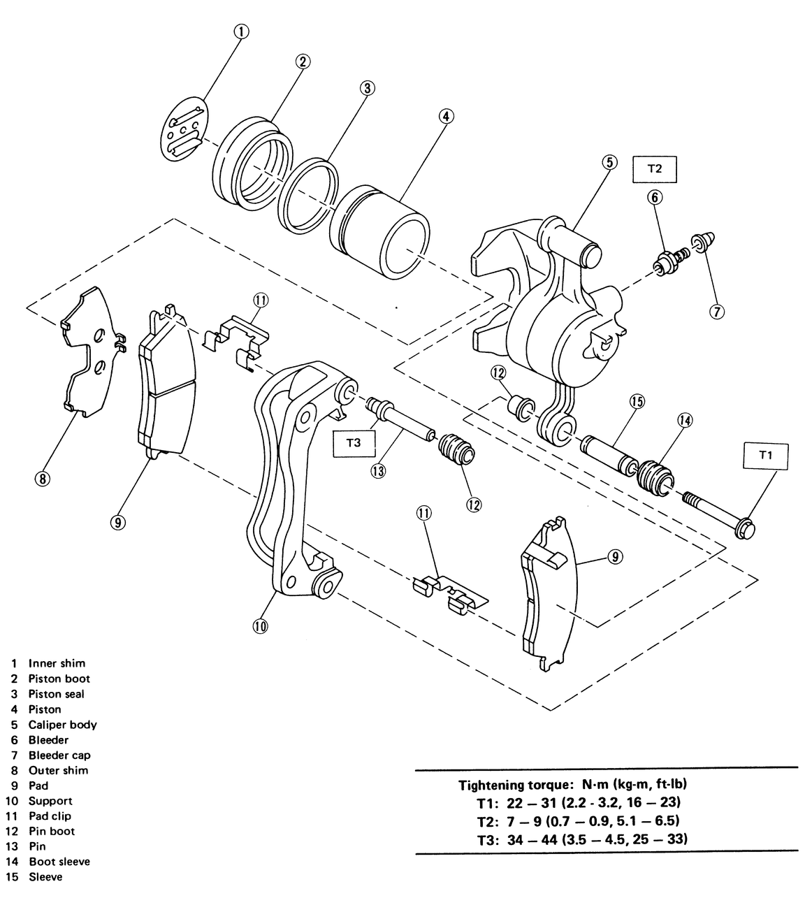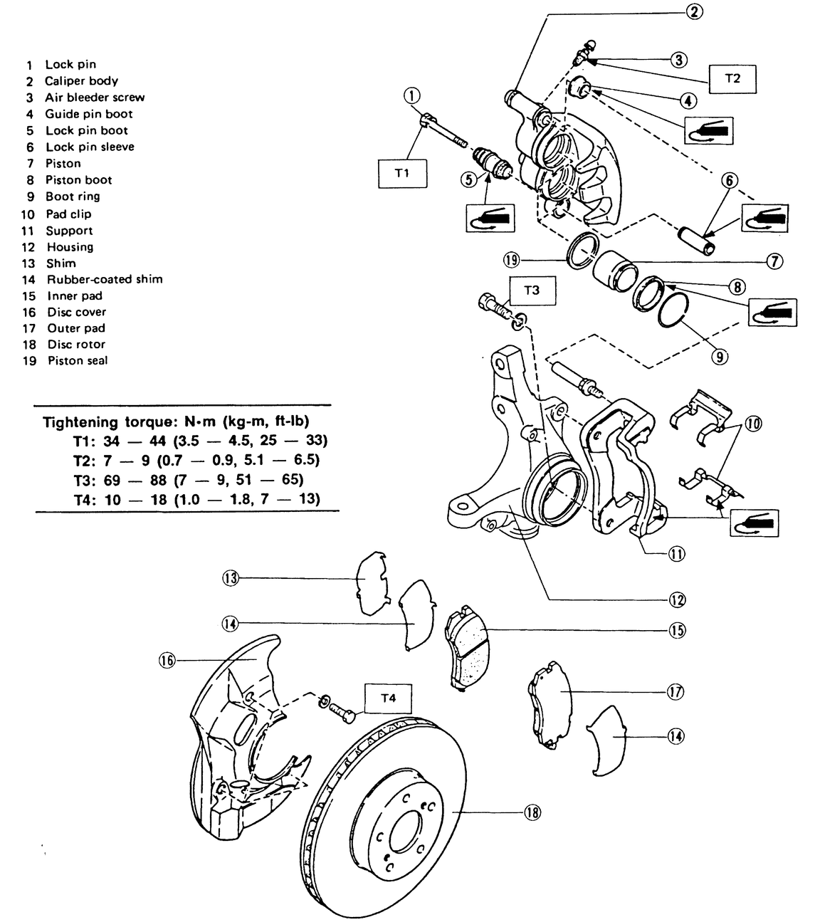 | Fig. 3: Front caliper and pad assembly — Coupe, Sedan, XT, Loyale, Wagon and Brat |