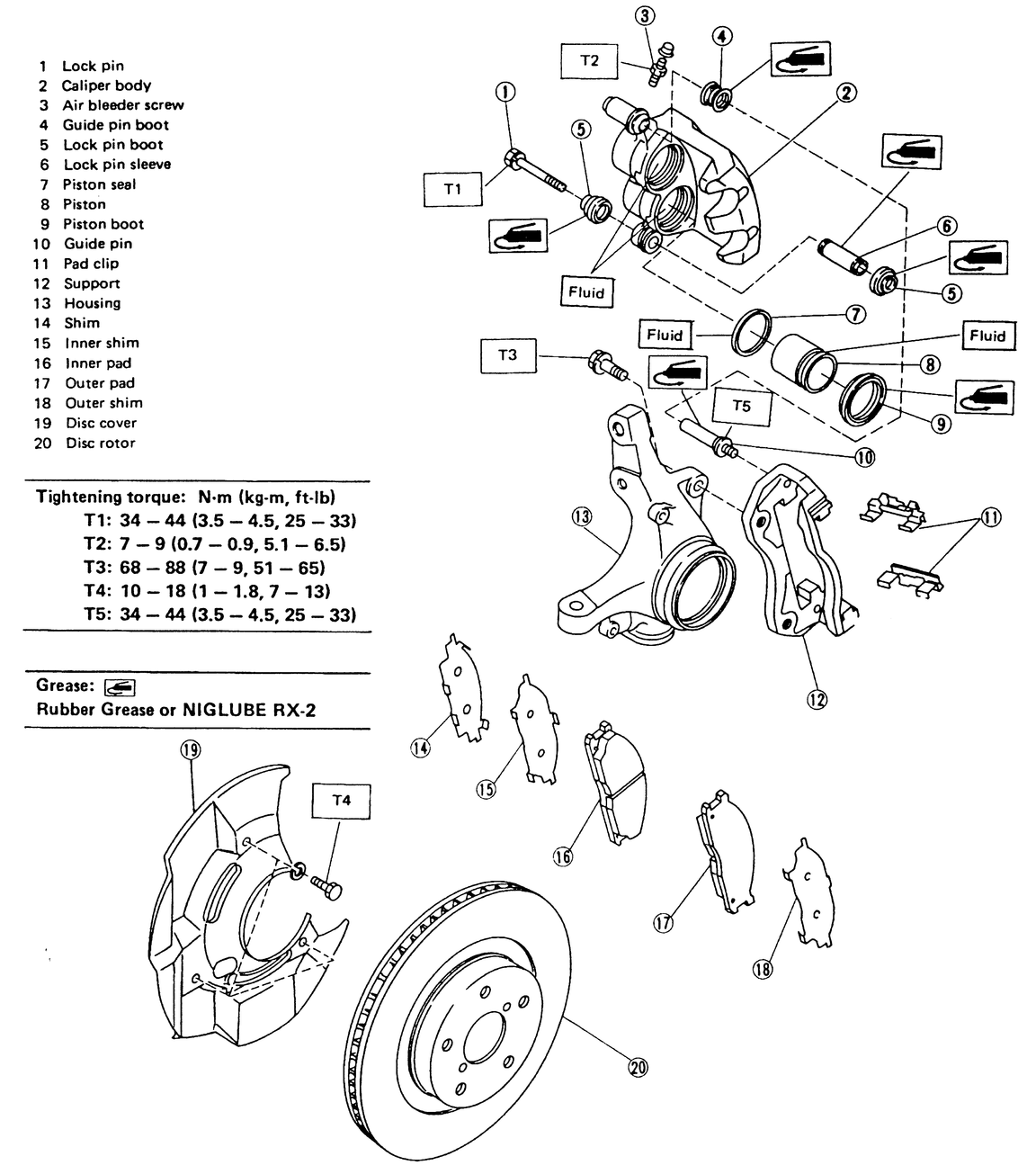 | Fig. 4: Front caliper and pad assembly — non-turbo Legacy and Impreza |