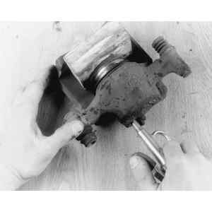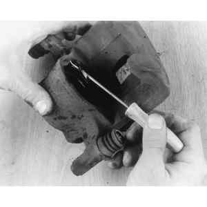 DO NOT apply high pressure compressed air to the caliper bore. The piston