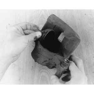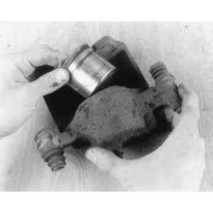 | Fig. 4: Remove the piston boot from the caliper . . .