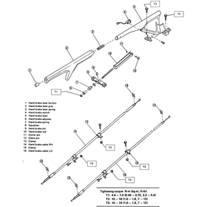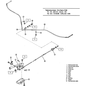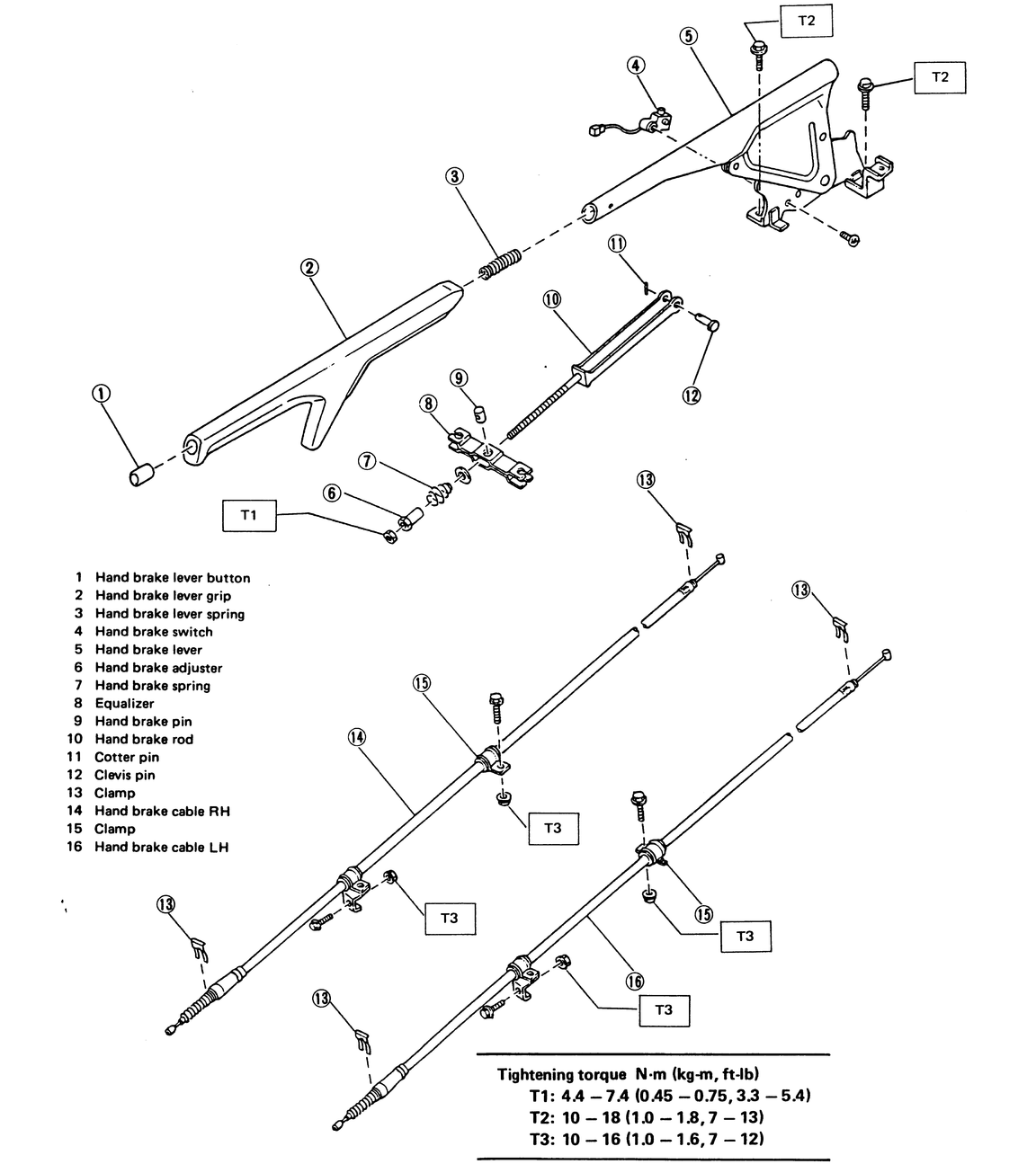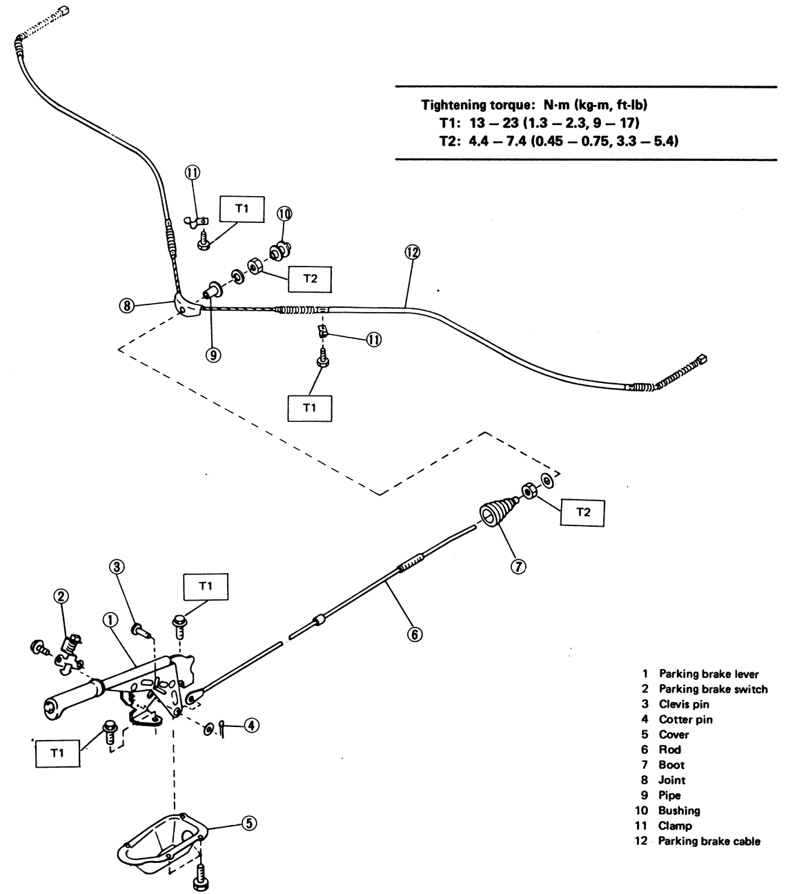 | Fig. 1: Parking brake assembly — Coupe, Sedan, XT, Loyale, Wagon and Brat |