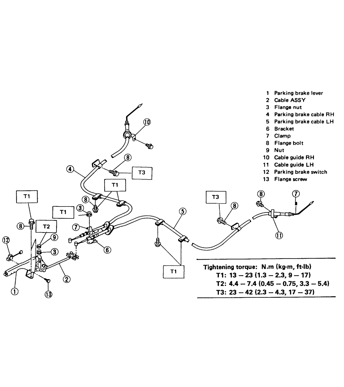 NOTE: The procedures given here are to be used as an outline. The position and number of clamps used to retain the parking brake cables may vary depending on vehicle year and time of production. Follow each of the cables from end to end, to be sure of routing and mounting.